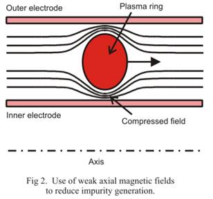 An attempt at reducing sputtering could be the following: Plasma stand-off coils shown in Fig. 1 would supply a weak axial magnetic field that is compressed between the electrically-conducting electrodes and the high-speed electrically-conducting plasma rings, as suggested in Fig. 2 below.